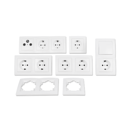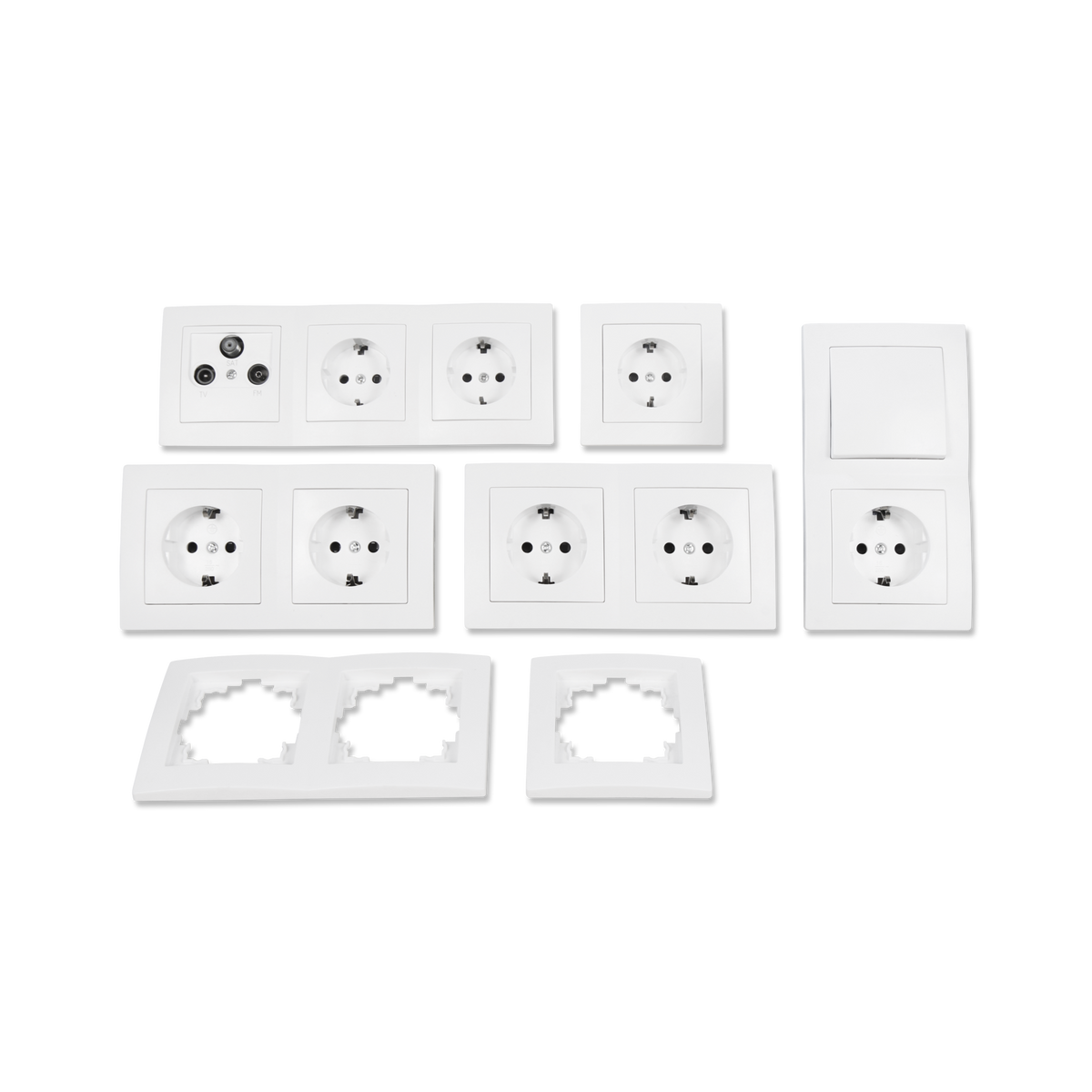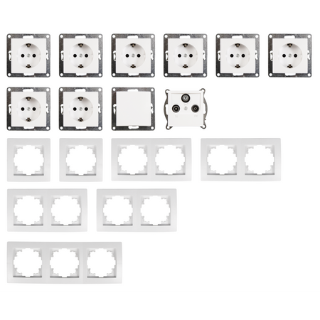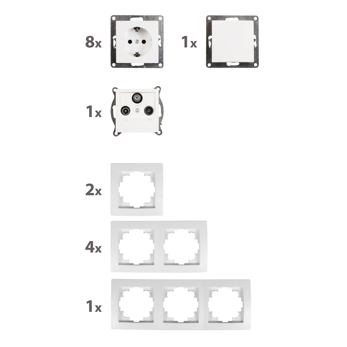 • 1x Wechselschalter 1534800 • 8x Steckdose 1534804 • 1x Antennendose • 1x Rahmen 3-fach 1534810 • 4x Rahmen 2-fach 1534809 • 2x Rahmen 1-fach 1534808