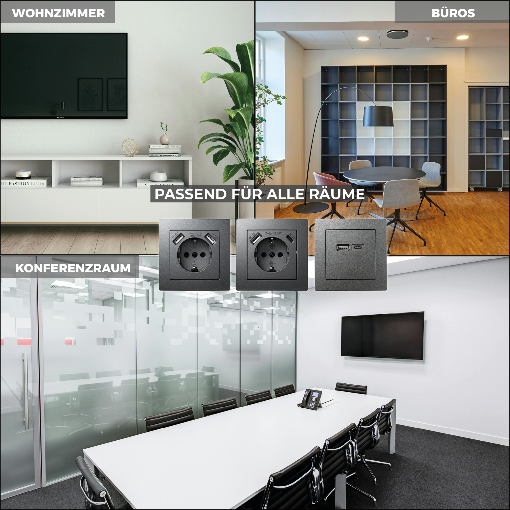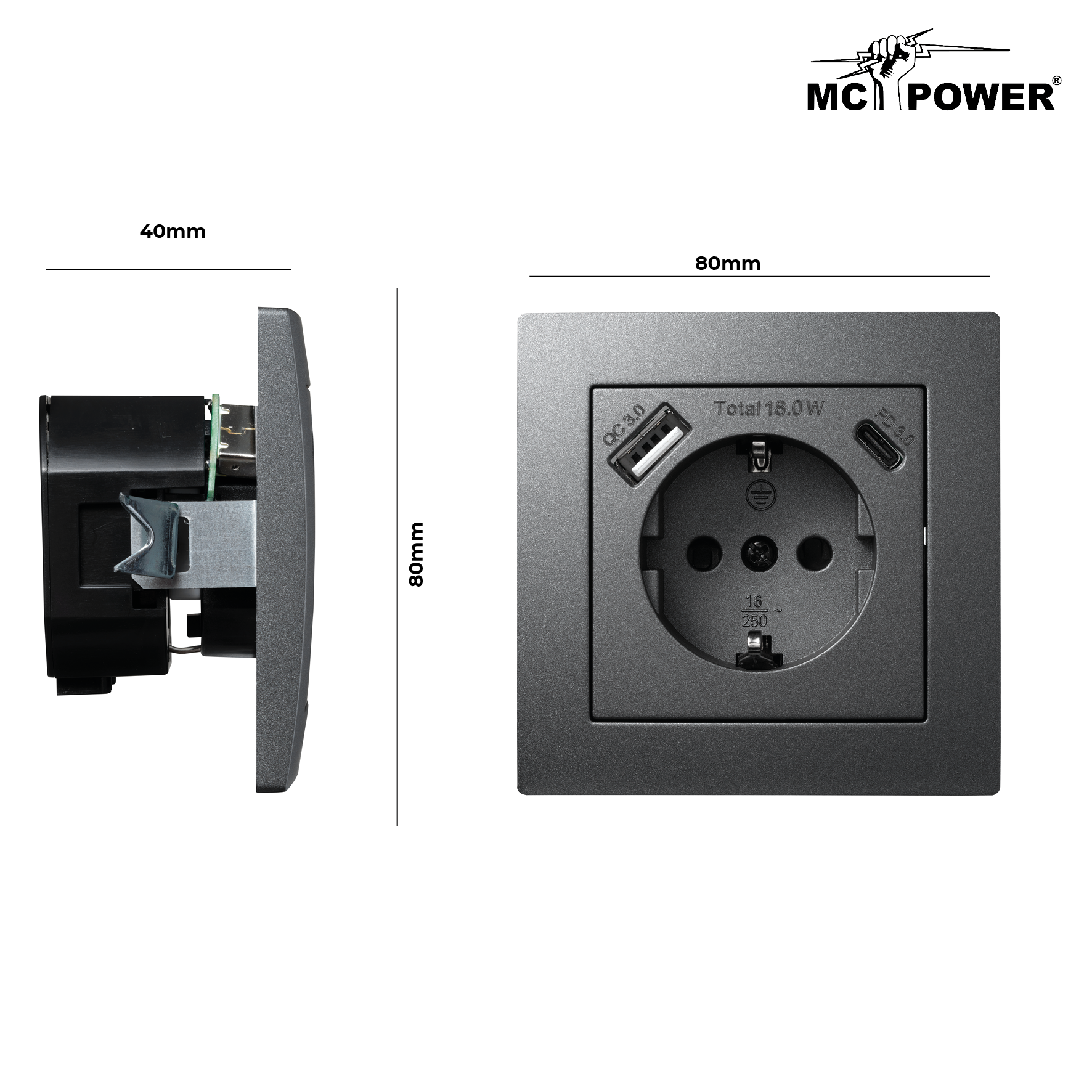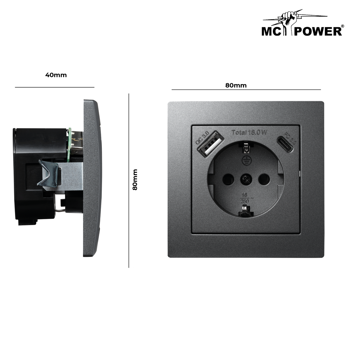 McPower "Flair" Schutzkontakt-Steckdose mit 1x USB-C 18W PD, 1x USB-A, UP, anthrazit
